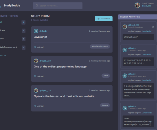 StudyBuddy is a web development project of mine where you can create study rooms and interact with other members. I have used HTML , CSS & JS for FrontEnd and Django for Backend.